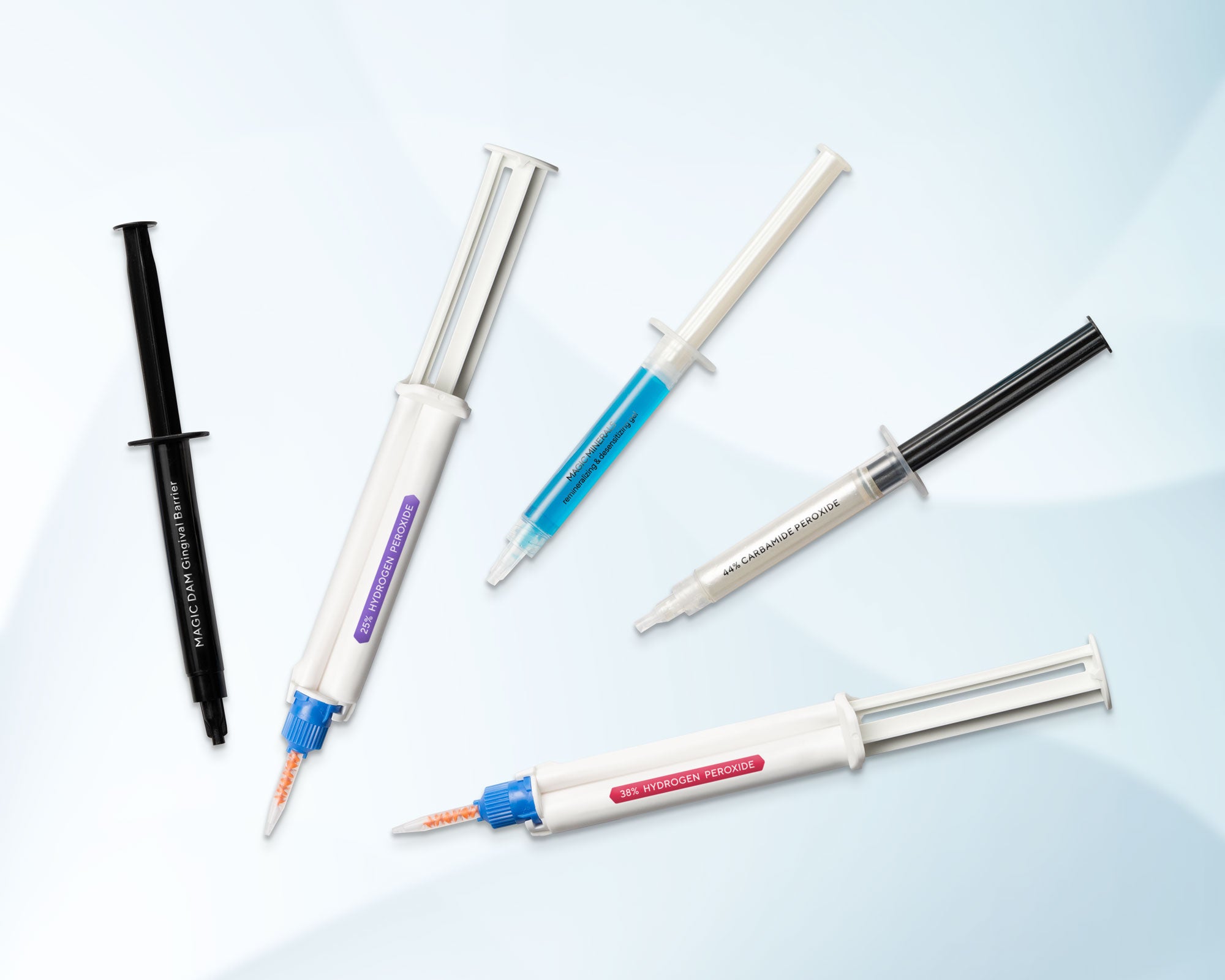 The bleaching gels contain potassium citrate to reduce sensitivity. Magic Minerals gel contains hydroxyapatite, calcium, and magnesium to strengthen teeth.